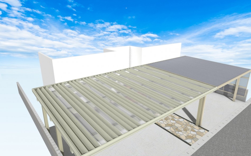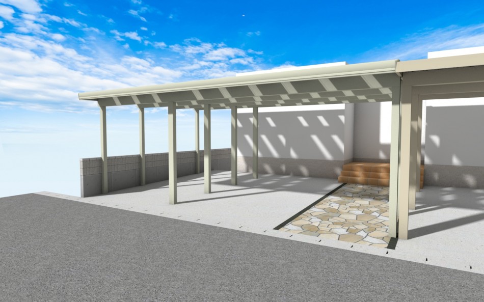 既存カーポートに合わせて新しいカーポート敷地を有効的に使って、3台用の中間柱ありと無しでご提案させて頂きます。